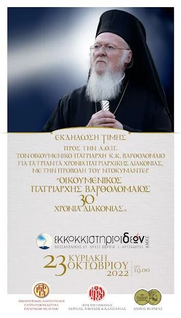 Τιμητική εκδήλωση για τα 30 χρόνια διακονίας του Οικουμενικού Πατριάρχη κ. Βαρθολομαίου θα πραγματοποιηθεί την Κυριακή 23 Οκτωβρίου στο Εκκοκκιστήριο Ιδεών, στις 7μμ.