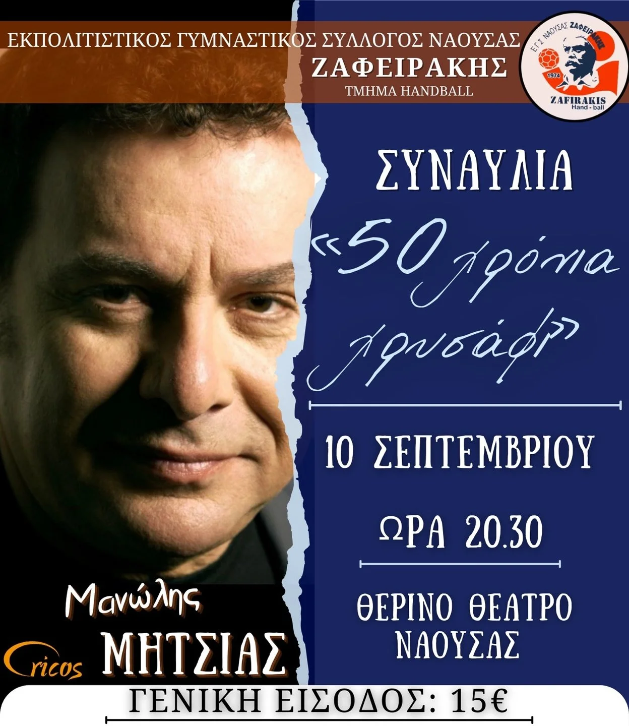 Συναυλία με τον Μανώλη Μητσιά διοργανώνει το τμήμα χάντ-μπολ του Ζαφειράκη, το Σάββατο 10 Σεπτεμβρίου, στο θερινό δημοτικό θέατρο Νάουσας ‘Μ. Μερκούρη’.