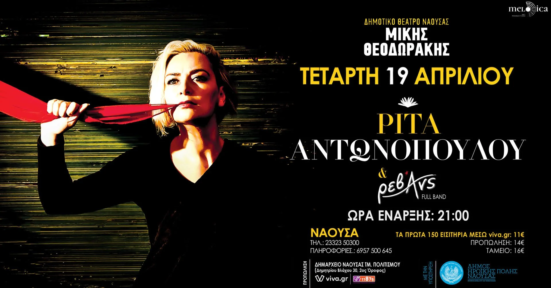 Στο ‘Μίκης Θεοδωράκης’ της Νάουσας θα εμφανιστεί την Τετάρτη 19 Απριλίου στις 9μμ η Ρίτα Αντωνοπούλου, μαζί με τους Ρεβάνς! Ενωμένοι οι καλλιτέχνες θα παρουσιάσουν στο κοινό μία παράσταση που λέει την αλήθεια. Μια παράσταση που αφυπνίζει, ξεσηκώνει, εμψυχώνει, συγκινεί και γιατρεύει.