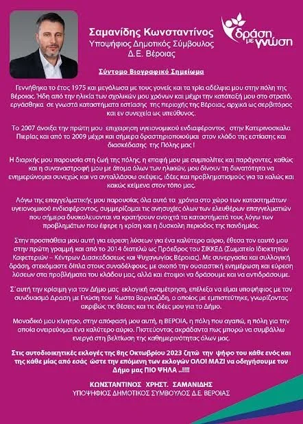 Υποψήφιος δημοτικός σύμβουλος με τον συνδυασμό ‘Δράση με Γνώση’ του Κώστα Βοργιαζίδη θα είναι ο Κώστας Σαμανίδης. Σύντομο βιογραφικό: