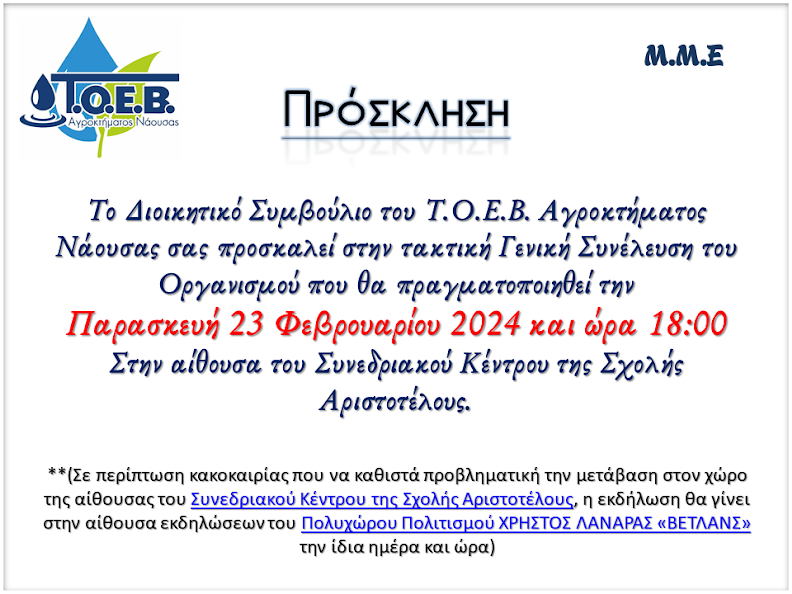 Την ερχόμενη Παρασκευή στις 6 το απόγευμα θα πραγματοποιηθεί η γενική συνέλευση του ΤΟΕΒ Νάουσας, στην αίθουσα του συνεδριακού κέντρου της Σχολής Αριστοτέλους.