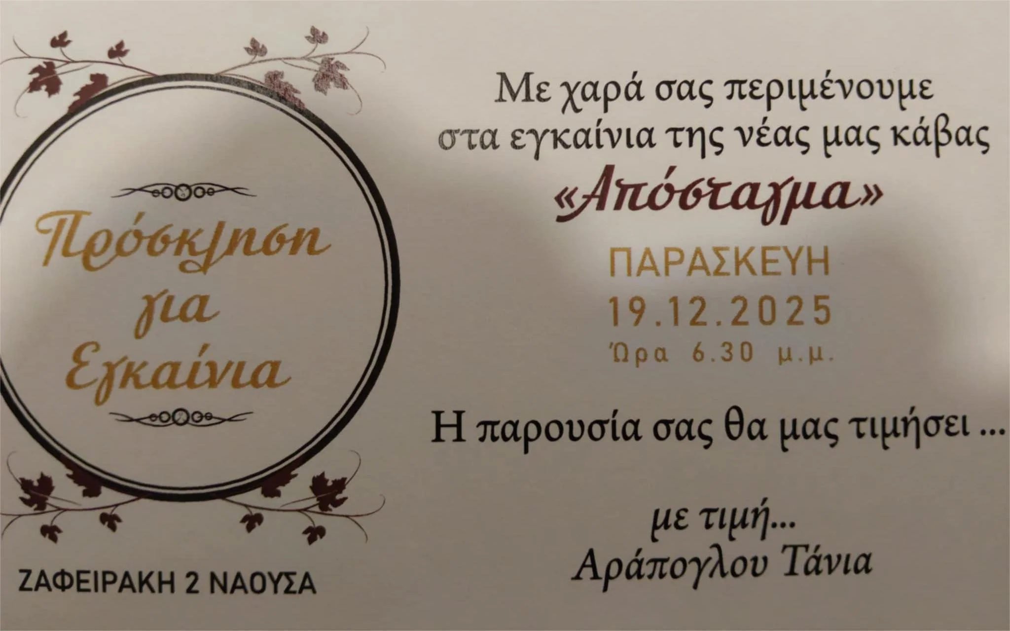 Την ερχόμενη Παρασκευή στις 6.30, με άρωμα Χριστουγέννων, εγκαινιάζεται στη Νάουσα η Κάβα Ποτών ‘Απόσταγμα’, της Τάνιας Αράπογλου, συζύγου του Νίκου Μουραφετλή.
