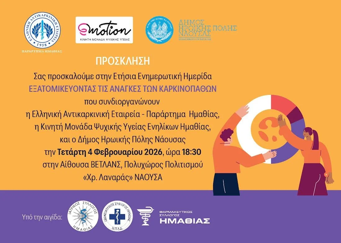 Στις 6 το απόγευμα της Τετάρτης θα πραγματοποιηθεί η ετήσια ενημερωτική ημερίδα της Ελληνικής Αντικαρκινικής Εταιρείας, παράρτημα Ημαθίας, με την ευκαιρία της Παγκόσμιας Ημέρας κατά του Καρκίνου 4 Φεβρουαρίου.