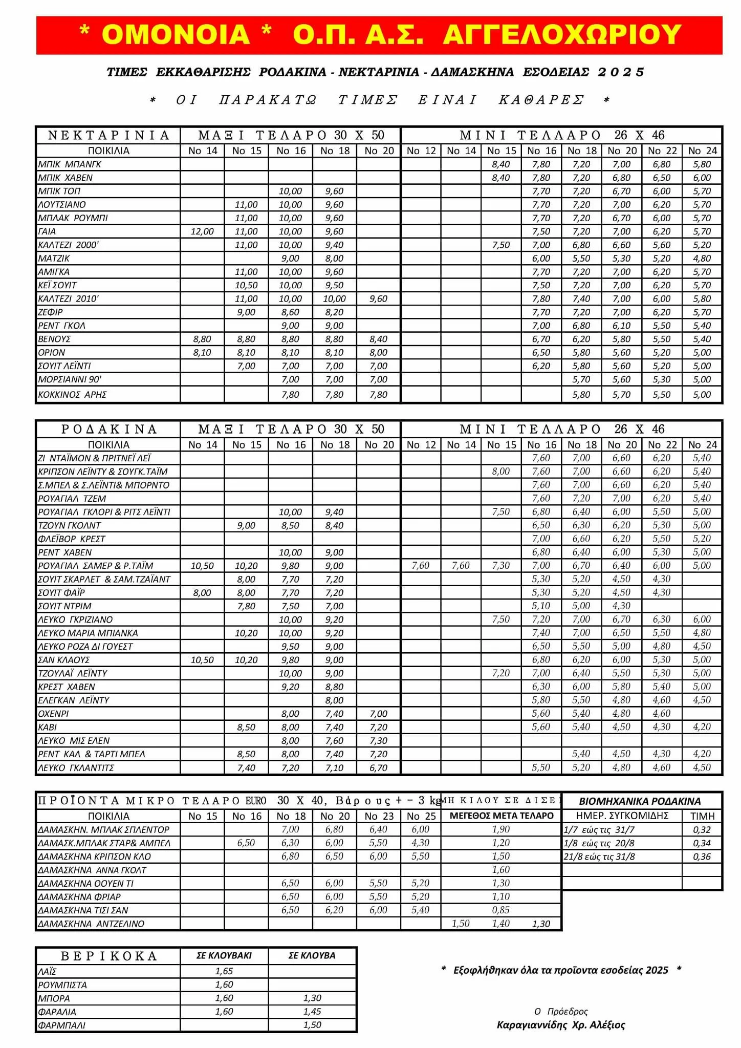 Τις τιμές εκκαθάρισης σε ροδάκινα, νεκταρίνια και βερίκοκα για το 2025 ανακοίνωσε ο Αγροτικός Συνεταιρισμός Αγγελοχωρίου ‘Ομόνοια’. Ενημερωθείτε στους πίνακες:
